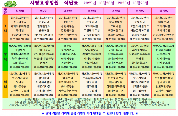 사랑요양병원 10월 넷째주 식단표