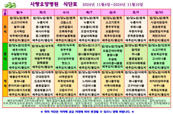 사랑요양병원 11월 첫째주 식단표