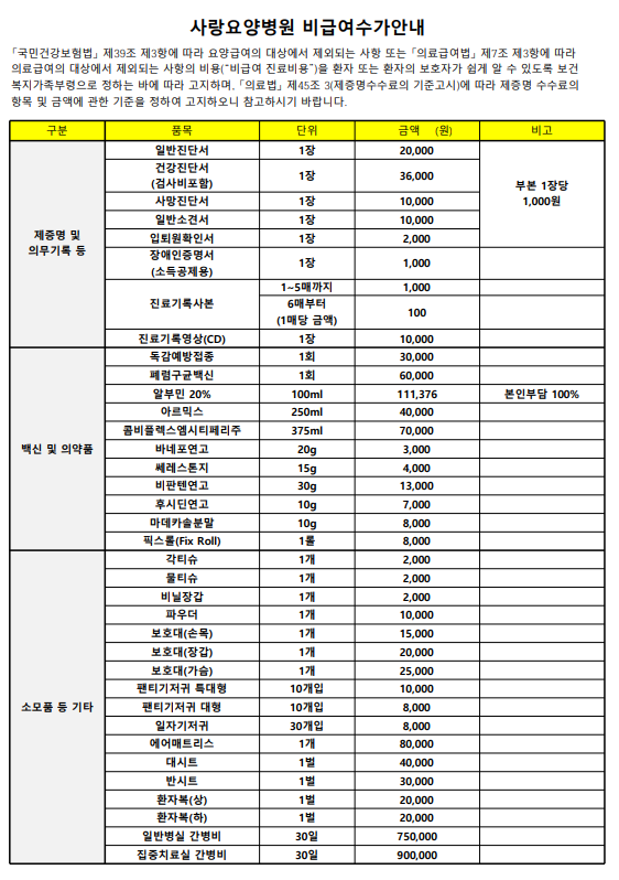사랑요양병원 비급여수가안내