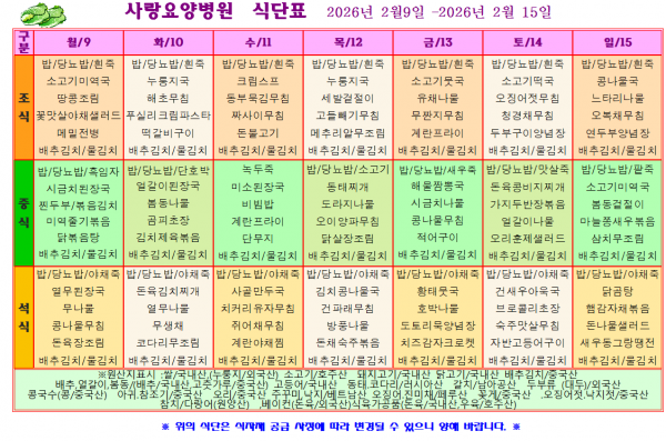 사랑요양병원 2월 둘째주 식단표